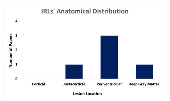 Lastly, the periventricular region was the highest anatomical location of IRLs presence while the cortical was the least. This is to be expected as MS lesions are commonly seen around the ventricles []. Although the focus of this review was mainly in the brain, IRLs were also found in the spinal cord [].