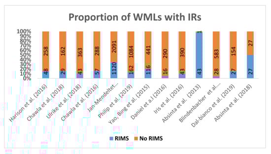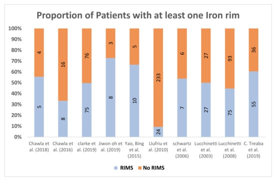 Ten papers reported the proportion of patients with at least one IRL, the mean of the total number of MS patients was 97.3 (range 9–257) [,,,,,,]. Eighty percent of the studies stated that rims could be detected in 50% to 70% of MS patients examined. Jiwon Oh et al. (2019) reported the highest percentage of IRLs presence which was 72% (8/11 MS patients) [] while only 10%with IRs reported by Llufriu et al. (2010) scanning (24/233 MS patients) []. Similarly, Chawla et al. scanned nine patients (4 RRMS, 5 Progressive) at 7T, and 55.5% of patients had rims [] (Figure 6). To sum up, histopathology and MRI study showed that 8–70% of MS lesions are surrounded by IRLs, which could be seen in both 3T and 7T [,].