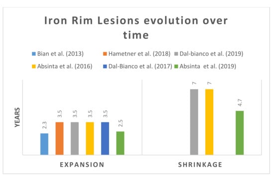 Eleven papers reported whether the IRLs expand or shrink without accurately specifying the time frame [,,,,,,,,,,]. However, six papers reported a different duration for expansion and shrinkage [,,,,,] (Figure 7). Longitudinal studies with a mean follow up of 3.5 years, observed slow expansion of IRLs that persist over time [,,], then gradually the hypointense rim disappearing, returning to contrast NAWM after seven years [,]. IRLs are frequently detected in young lesions and early disease [,].