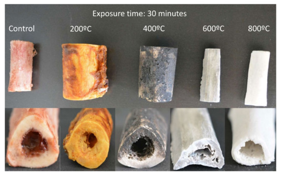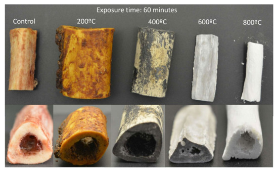 High temperatures alter the chemical properties and structural integrity of bones through four stages: dehydration, decomposition, inversion, and fusion. Due to these changes, heat can produce fractures and bone will experiment measurable changes in dimensions, weight, porosity, crystallinity, and color [6,22]. Color bone changes due to heat are related to changes in the chemical composition of the organic components. When bone samples are exposed to heat in a muffle oven, the exposure to heat is uniform, which differs from the profound inhomogeneity of temperature in some real forensic and anthropological cases. Nevertheless, similar color changes can be expected in both experimental and real cases [20,22].