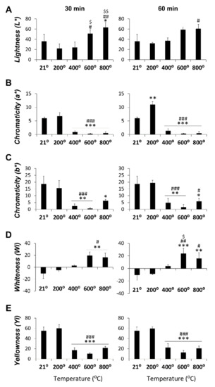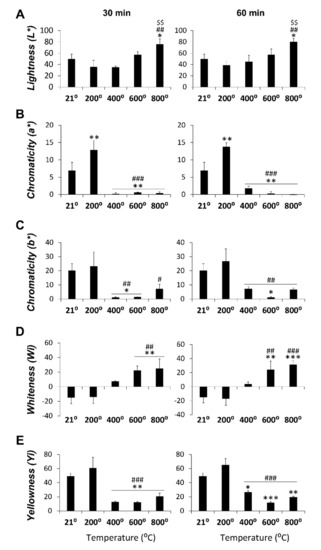 Figure 4 depicts statistical significance between temperature groups for all spectrophotometric parameters in the medullar zone at 30 min (main factor: F4,14 > 11.13, p < 0.0003) and 60 min (main factor: F4,15 > 9.95, p < 0.0004) of exposure. L* values were statistically significant at 800 ℃ and 600 ℃ compared to the 200 ℃ group and at 400 ℃ and 800 ℃ compared to the control group at 30 min of exposition (Figure 4A). However, at 60 min, L* values significantly increased at 800 ℃ compared to the 200 ℃ group. The lowest significant values of chromaticity a* were observed at 400, 600, and 800 ℃ compared to the control and 200 ℃ groups in both exposure times. The highest chromaticity a* value was found at 200 ℃ at 60 min and was statistically significant compared to the control group (Figure 4B). The lowest significant values of chromaticity b* were detected at 400 and 600 ℃ versus the control and 200 ℃ groups in both exposure times. At 800 ℃, statistical significance with the control group at 30 min and with the 200 ℃ and control groups at 60 min were seen (Figure 4C). WI values at 30 min and 60 min of exposition showed statistical significance at 600 and 800 ℃ compared to the control and 200 ℃ groups and at 600 ℃ compared to the 400 ℃ group at 60 min (Figure 4D). The lowest YI values were found at 400, 600, and 800 ℃ and were statistically significant compared to the control and 200 ℃ groups in both exposure times (Figure 4E).