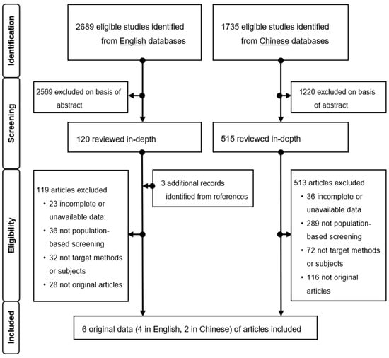 A literature search was conducted for studies published between 1 January 2000 and 31 December 2019. PubMed, Web of Science, and China National Knowledge Infrastructure databases were searched with the following keywords: “breast neoplasms”, “breast cancer”, “mass screening”, “ultrasound”, “radiography”, “mammography”, and “Asia”. Study titles, abstracts, and texts were screened independently by two authors (J.W. and L.D.). An example of the search strategy in PubMed can be found in Table S1. Disagreements between the two authors were resolved by consensus with a third author (W.L.). All searches were supplemented by checking the references of the identified articles.