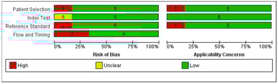 The results of the QUADAS-2 assessment are presented in Figure 2. Concerning participant selection in the six included studies, the risk of bias in participant selection was high in one study and low in the remaining five studies (Figure 2). In two studies, the risk of bias was high and was mainly related to the “Flow and Timing” domain.