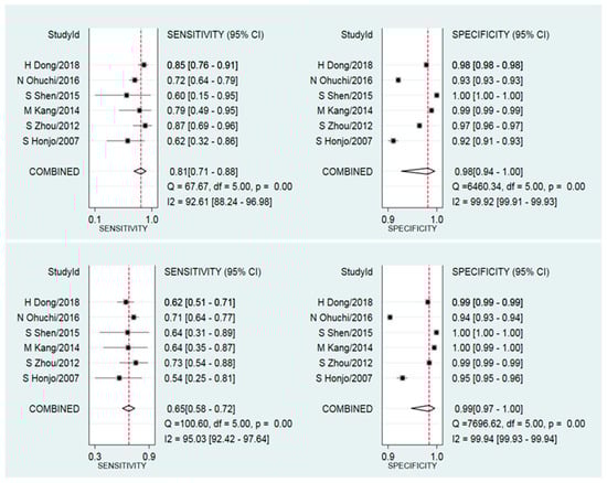 Forest plot of the sensitivity (left) and specificity (right) of mammography (top) and ultrasound (bottom) breast cancer screening in Asian women.
