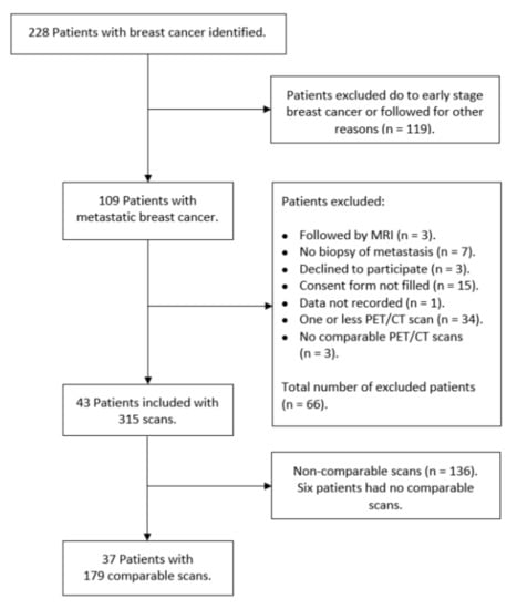 - Helland, F.; Hallin Henriksen, M.; Gerke, O.; Vogsen, M.; Hoilund-Carlsen, P.F.; Hildebrandt, M.G. FDG-PET/CT Versus Contrast-Enhanced CT for Response Evaluation in Metastatic Breast Cancer: A Systematic Review. Diagnostics 2019, 9, 106. [Google Scholar] [CrossRef] [PubMed]