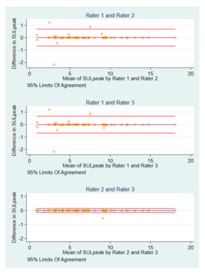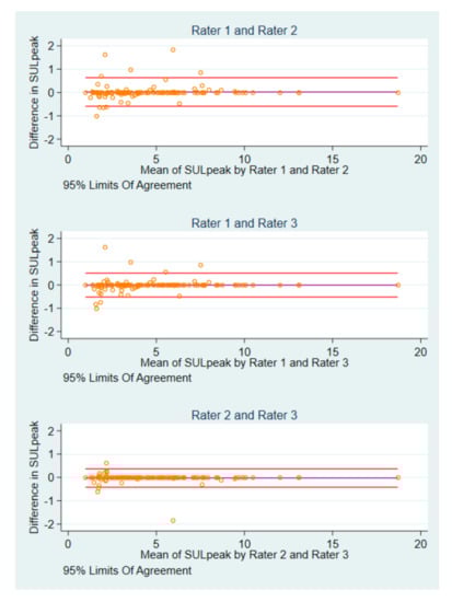 - Marom, E.M.; Munden, R.F.; Truong, M.T.; Gladish, G.W.; Podoloff, D.A.; Mawlawi, O.; Broemeling, L.D.; Bruzzi, J.F.; Macapinlac, H.A. Interobserver and intraobserver variability of standardized uptake value measurements in non-small-cell lung cancer. J. Thorac. Imaging 2006, 21, 205–212. [Google Scholar] [CrossRef]
