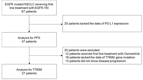 Between 2014 and 2019, 67 patients with EGFR-mutant NSCLC received first-line treatment with EGFR-TKIs. Of these, 20 cases whose records lacked the data on tumor PD-L1 expression were excluded, and the data of the remaining 47 patients were analyzed to determine the PFS. Then, after a total of 20 patients, including 12 patients who were treated with osimertinib, 18 patients whose records lacked data on the T790M gene mutation status, and 13 patients who did not show disease progression were excluded, and the data of the remaining 27 patients were analyzed to determine the presence/absence of T790M (Figure 1).