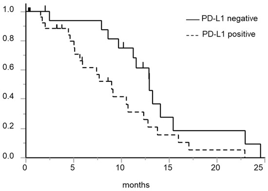 Kaplan-Meier curve for PFS after the initiation of first-line EGFR-TKI treatment in patients with and without tumor PD-L1 expression. Solid line: Patients with negative tumor PD-L1 expression; dashed line: Patients with positive tumor PD-L1 expression. The PD-L1-negative patient group showed a longer PFS than the PD-L1-positive patient group (p = 0.029, log-rank test).