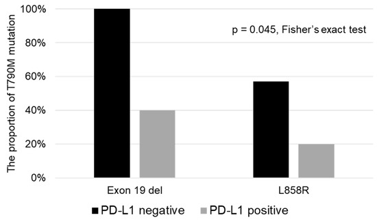 Several studies have reported that the proportion of acquisition of T790M is higher in patients with exon 19 deletion mutation of EGFR [5,7]. The findings of our study (Figure 3) suggest that the tumor PD-L1 status is associated with the likelihood of acquisition of T790M, independent of the EGFR mutation, that is, exon 19 deletion or exon 21 L858R. However, because the sample size in the present study was small, it is necessary to verify the findings in a larger clinical study.