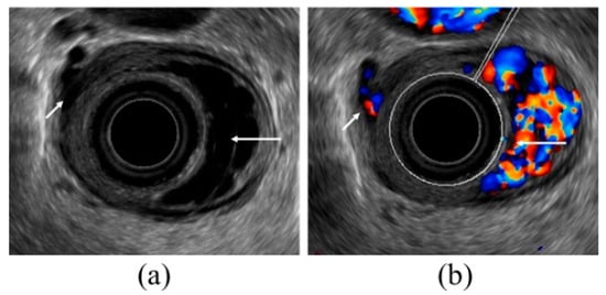 For EUS observation of varices, a thin probe (20 MHz ultrasonic mini probe (UMP)) and a specialized EUS device (electronic radial-arrayed EUS) are used. When conducting detailed observation of the morphology of varices and localized hemodynamics surrounding varices, the 20 MHz UMP with high resolution should be used. Using this type of device enables observation of the 1–2 mm blood vessel group that is difficult to observe in detail on conventional EUS devices (Figure 2). When performing electronic radial-arrayed EUS, it is difficult to achieve detailed esophageal intramural and extramural evaluation, which is possible with UMP. However, the color Doppler function enables identification of the direction of the blood flow of perforating veins communicating between the esophageal varices and extramural blood vessels, and it also aids in understanding the hemodynamics surrounding the esophageal varices in greater detail [14,15] (Figure 3). Perforating veins with blood flow into esophageal varices may remain after treatment and contribute to recurrence, which suggests the importance of eliminating these at the time of treatment. Ideally, these two types of devices will be used properly in accordance with the requirements of each case. Normally, observation is performed using conventional UMP, and if a large number of perforating veins are markedly observed, electronic radial-arrayed EUS is used to observe the perforating veins, including the blood flow direction.