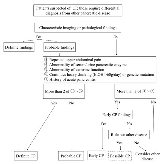 The characteristic imaging findings have also been revised. MRCP can be used for initial screening because of recent improvements in its resolution. Ito et al. [41] reported that irregular dilatation of three branches on MRCP was more often observed in early CP, defined by JPS criteria 2009, compared to non-early CP. The EUS findings were revised to be simpler because of problems with inter-observer agreement rates [42,43,44]. The EUS findings are as follows: (1) hyperechoic foci (non-shadowing) or strands, (2) lobularity, (3) hyperechoic MPD margin, and (4) dilated side branches. At least two of the four EUS findings, including (1) or (2), are required for the diagnosis of early CP. The presence of cysts was excluded because it can be difficult to distinguish pancreatic cysts such as intraductal papillary mucinous neoplasm. A diagnostic flowchart for CP created by the author based on the 2019 JPS CP criteria is shown in Figure 2.
