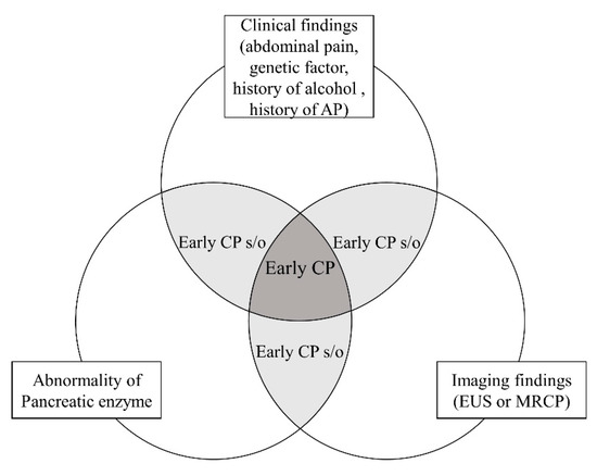The JPS criteria were the first to refer to the diagnosis of early CP, and it is expected that revision will further increase their accuracy. However, an international consensus definition of early CP has yet to be reached due to several limitations. Some patients diagnosed with early CP progress to CP and others do not. This may be due to the low accuracy of the diagnostic criteria for early CP. Another problem is the low inter-observer agreement rate of EUS findings for CP. Koh et al. [44] reported a multicenter validation study in Asia. In this study, the inter-observer agreement rates were determined for “Hyperechoic foci with shadowing”, “Non-shadowing hyperechoic foci”, “Strands”, “Lobularity with non-contiguous lobules”, “Lobularity with honeycombing”, “Cysts”, “Dilated main pancreatic duct”, “Irregular pancreatic duct”, “Hyperechoic duct wall”, “Dilated side branches”, “Calculi in the main pancreatic duct”. Cysts and the calculi in the main pancreatic duct had a kappa > 0.8, five factors (hyperechoic foci with shadowing, lobularity with honeycombing, dilated main pancreatic duct, irregular pancreatic duct, dilated side branches) had a kappa of 0.6–0.8, and four factors (non-shadowing hyperechoic foci, strands, lobularity with non-contiguous lobules, hyperechoic duct wall) had a kappa < 0.6. Diagnostic criteria consist of clinical, hematological, and imaging findings. Some patients may meet some, but not all, of the diagnostic criteria, and those are classified as suspected early CP. The concept of early CP or suspected early CP is shown in Figure 3.