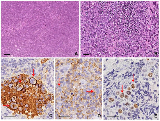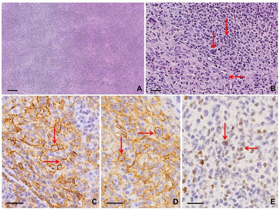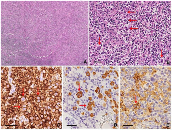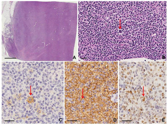 - Liang, K.; Wang, J.; Wang, Y.; Zhou, Z.; Ge, S.; Mei, S.; Li, H.; Jing, X.; Zhang, C. The Histologic, Immunohistochemical, and Genetic Features of Classical Hodgkin Lymphoma and Anaplastic Large Cell Lymphoma with Aberrant T-cell/B-cell Antigen Expression. Hum. Pathol. 2019, 84, 309–320. [Google Scholar] [CrossRef]