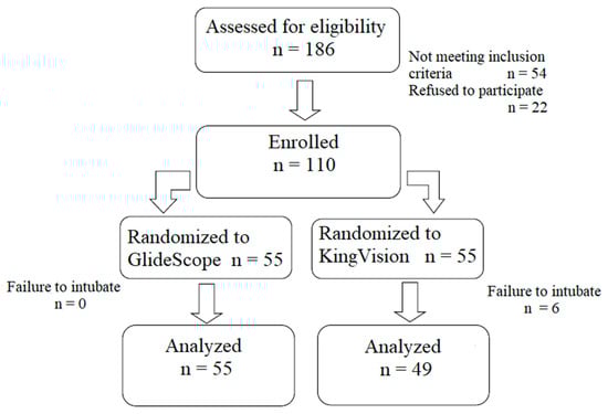 During the study period, 186 obese patients were screened for enrollment. Following the exclusion of 76 patients who did not meet the inclusion criteria or refused to participate, in total 110 patients were enrolled, 55 in each group (Figure 3). Demographic data and preoperative airway assessment parameters did not show any statistically significant difference between the groups, apart from for mouth opening and neck circumference (Table 1).