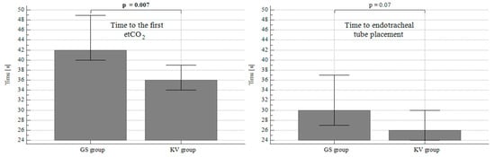 Sub-group analysis of patients with class III obesity (24 patients in each group, BMI ≥ 40 kg∙m−2) revealed a shorter time to the first etCO2 wave on the monitor in the KVL group 34.0 s [95% CI 32.6–36.7 s] vs. 41.0 s [95% CI 36.7–43.3 s] (p = 0.02) but similar time to tracheal tube placement—27.5 [95% CI 24.0–32.5 s] in the GS group vs. 25.0 [95% CI 22.0–28.5 s] (p = 0.27). The success rate was higher in the GS group—100% vs. 79.2 in the KVL group (p = 0.049).