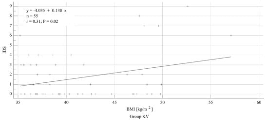Linear regression model between increasing IDS and BMI in the KVL group.