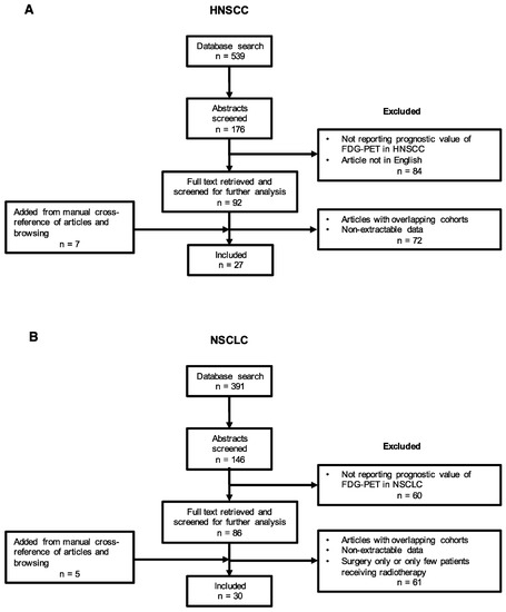 Flow diagram of the study selection process for the meta-analysis (A: HNSCC, B: NSCLC).