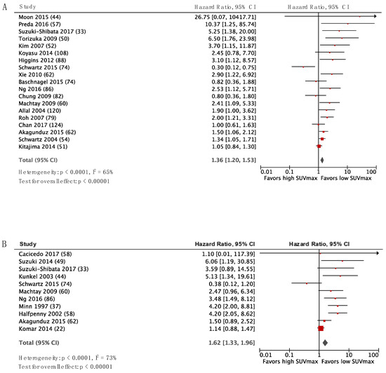 Forest plots for SUVmax as a predictor of DFS (A) and OS (B) in HNSCC. The number of patients included in each study is specified in parenthesis.