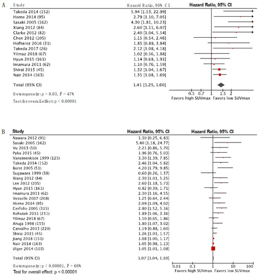Forest plots for SUVmax as a predictor of DFS (A) and OS (B) in NSCLC. The number of patients included in each study is specified in parenthesis.