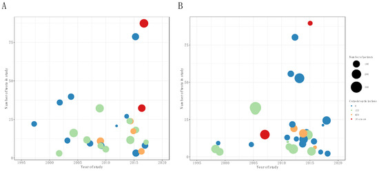 Bubble plot of number of patients included in study versus year of publication for HNSCC (A) and NSCLC (B). Bubble size is proportional to number of statistical tests counted in paper (large is problematic) and color denotes the number of cut-point optimization performed (the fewer the better).