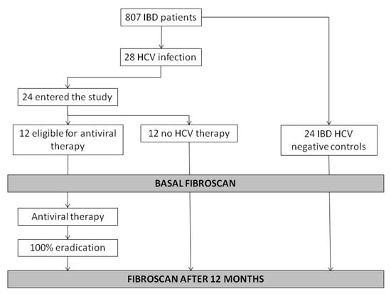 The study was approved by the independent Ethics Committee of the Policlinico di Bari (protocol no. 4862, 3 May 2017) and was performed according to the Helsinki declaration 1975 statements. We enrolled IBD patients with CHC, revealed by positive serum detection of anti-HCV antibodies and HCV-RNA, in the period October 2016–October 2018. All patients underwent anti-HCV antibody evaluation and, in the case of positivity, HCV-RNA dosing and genotype analysis were performed. All patients at baseline underwent measurement of liver stiffness by elastography. Then, those patients who were eligible for antiviral therapy according to the Italian indications of the “Agenzia Italiana del Farmaco”, received DAA. Therefore, we followed up HCV treated and untreated subjects. One year later, all IBD-HCV patients had a second measurement of liver stiffness.