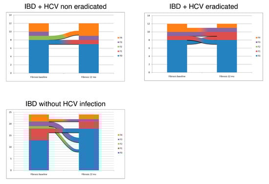 Among the 24 IBD patients without hepatitis, 18 had a stable stage. No progression of fibrosis was observed, while in six cases we found an improvement (two from F1 to F0, two from F3 to F0, one from F4 to F3 and one from F2 to F0).