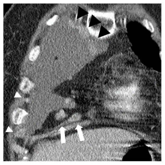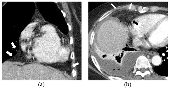 Multiple nodular areas of pleural thickening with contrast enhancement (black and white arrowheads) are noted in the right pleural effusion (asterisks) on a coronal CT image at the level of the right ventricle. Note multiple enlarged lymph nodes measuring >1 cm (white arrows), but absence of phlegmonous appearance in the ipsilateral paracardiac fat.