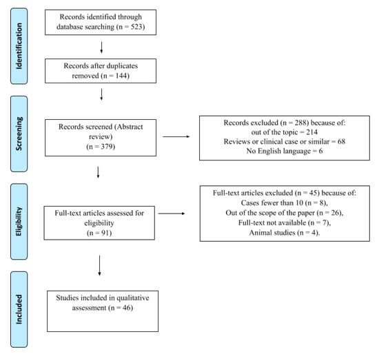 A total of 523 articles were identified in the comprehensive literature search in Pubmed/Scopus/Google Scholar/Cochrane/EMBASE. Excluding duplicates, 379 articles were screened. Two-hundred eighty-eight articles were excluded (not associated with the main topic, reviews, clinical cases, no English language) and 91 articles were evaluated for eligibility. Forty-five articles out of 91 were deleted for the following reasons: cases fewer than 10 (n = 8), aim not within the scope of the paper (n = 26), full-text not available (n = 7), animal studies (n = 4). Forty-six studies were included in this systematic review (Figure 1) and were divided based on clinical setting (i.e., diagnosis, preoperative staging, prognosis, tumor recurrence, treatment response assessment and change of management; Table 1).