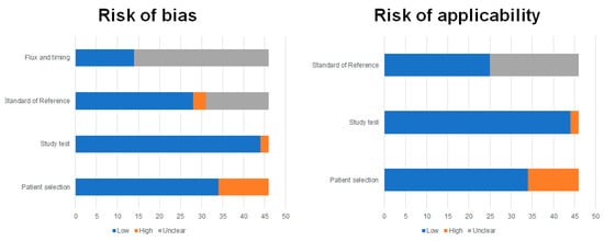 The Quadas-2 results are reported in Figure 2. As illustrated, many studies showed unclear flow and timing and, in some cases, no standard of reference was reported.