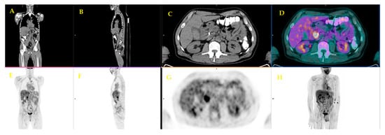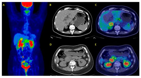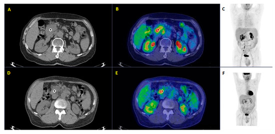 Figure 4 and Figure 5 show an example of a positive FDG PET/CT in a patient with a recent diagnosis of PDAC. FDG PET/CT was performed for the evaluation of potential distant metastases.