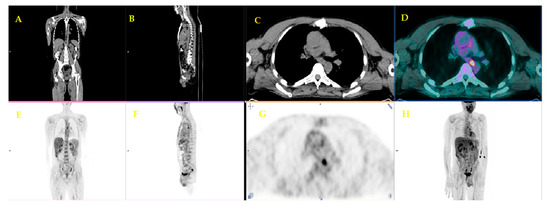 Lymph-nodal uptake suggestive of metastasis in the same patient (Images from Nuclear Medicine Unit, Padova University Hospital). Legend: A = Coronal image of low-dose CT; B = Sagittal image of low-dose CT; C = Axial image of low-dose CT; D = PET/CT fused image; E = Coronal image of PET; F = Sagittal image of PET; G = Axial image of PET; H = Maximum intensity Projection (MIP).