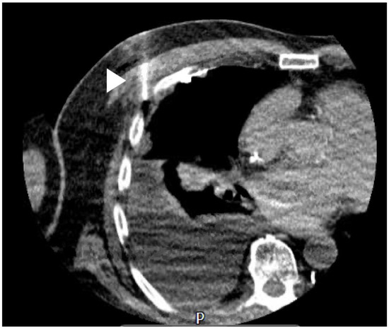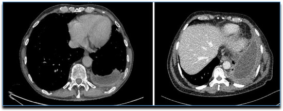 Whilst TUS can identify septations within an effusion better than CT, in cases of advanced empyema with a non-draining collection, CT can be used to check drain position and plan for thoracic surgical intervention. The “split pleura” sign (Figure 8) and the presence of >30 mm distance between the parietal and visceral pleura were shown to correctly identify a complex parapneumonic pleural effusion (CPPE) from a simple PPE with a sensitivity of 79.4% and specificity of 80.9% [100,101]. A number of other features are also seen in empyema, though they are not specific to the condition and can represent a PPE too: contrast enhancement of the pleura, thickened parietal pleura, increased attenuation and/or thickness of extra pleural subcostal fat, gas bubbles suspended within PF, or loculation of PF [96].