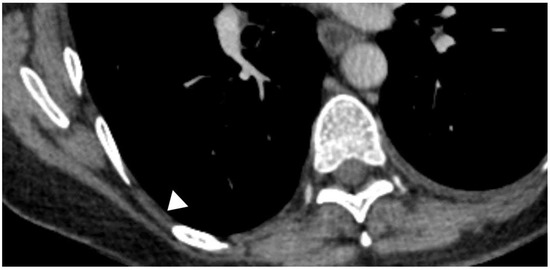 Whilst TUS has its many uses, there is no replacement for cross-sectional imaging which can provide a three-dimensional reconstruction of the chest and pleural cavity in a way TUS might struggle to, except in the hand of the most skilled operators. In health, it is difficult to visualise the pleura on CT scan and the “intercostal stripe” is often a surrogate; it consists of visceral and parietal pleura, extrapleural fat, endothoracic fascia, and the innermost intercostal muscles (Figure 7) [96].