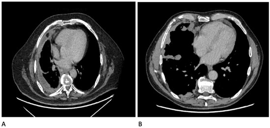CT images showing some features of malignant pleural disease: (A) Circumferential pleural thickening; (B) Nodular pleural thickening involving mediastinal surfaces and fissures.