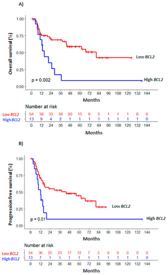 Overall survival (A) and progression-free survival (B) Kaplan—Meier curves of patients with high vs. low BCL2 expression levels.
