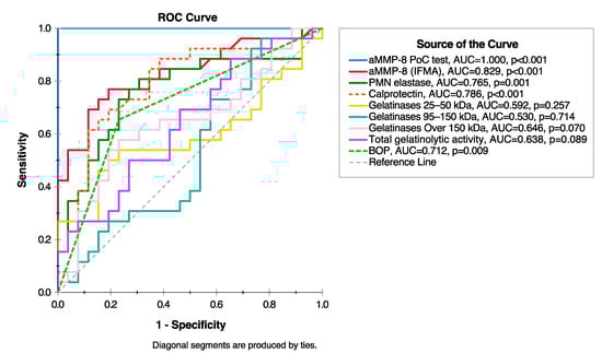 Receiver operating characteristic (ROC) analysis illustrating the diagnostic ability of active matrix metalloproteinase-8 (aMMP-8) chair-side/point-of-care (PoC) test and selected potential biomarkers: polymorphonuclear leukocyte (PMN)/neutrophil elastase, calprotectin, gelatinases (25–50 kDa, 95–150 kDa, over 150 kDa and total gelatinolytic activity) and bleeding on probing (BOP) to discriminate peri-implantitis from healthy dental implant (26 peri-implant and 26 healthy dental implant patients). aMMP-8 PoC test and selected potential biomarkers were assessed as described previously []. This figure has been constructed by authors ITR and TS based on the same study group as described in Lähteenmäki et al. and further extends their results [].