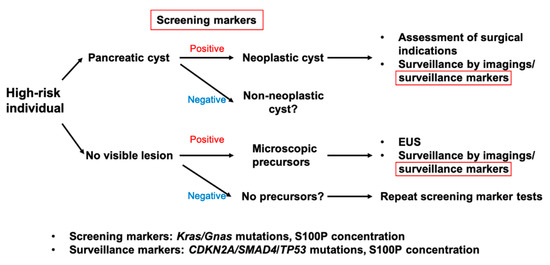 The PJ has the potential to provide evidence of the presence or absence of dysplasia and cancer, which are not evident on imaging. Pure PJ obtained via ERP would be an ideal source for biomarker detection. However, purity seems to be becoming less important because DF contains sufficient cells or proteins derived from pancreatic tumors to detect genetic alterations or novel protein markers. Based on our current understanding of the relationships between biological process and natural history of pancreatic cancer, each biomarker plays a role in the early detection of PDAC, as presented in Figure 2. For example, KRAS mutations, more than 90% of low-grade PanINs harbor the mutations of this, would be representative screening biomarkers in individuals at high risk of pancreatic cysts or apparently normal pancreas. In the longitudinal surveillance of patients with mucinous pancreatic cysts or those who are suspected of having microscopic precursors by screening tests, surveillance markers with high sensitivity and specificity would be used in combination with imaging modalities. In addition to identifying genetic alterations observed in the late phase of PDAC carcinogenesis, increasing the concentration of screening biomarkers might equally be useful. Based on our previous works [11,13], a multi-institutional study to validate S100P test in DF from PDAC patients is ongoing. Further studies, including ours, will provide accurate biomarker assays with minimal invasion, which satisfy strategies for early detection of PDAC in asymptomatic individuals.