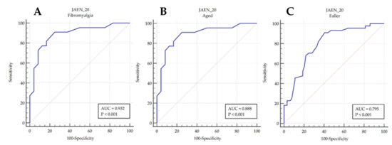 The ROC curve analysis showed that cut-off values of more than 21, 22, and 25 points in the 20-item JAEN screening tool were able to discriminate between healthy and older adults, fibromyalgia subjects, and fallers and non-fallers subjects, respectively. Predictive values and cut-off points are shown in Table 7.