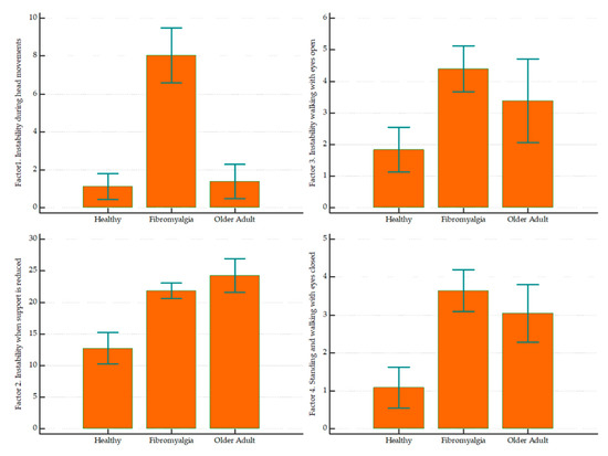 Finally, the ANOVA showed statistically significant differences between groups for each factor in the 20-item JAEN screening tool (Table 8). The analysis revealed that FMS patients and older adult subjects had worse static balance through an unstable stance (Factor 2). In addition, the results show that gait during unsteadiness conditions with open eyes or closed was worse in FMS patients and older adults than in healthy subjects (Factor 3 and 4). In Figure 2, it is possible to appreciate that subjects with FMS present greater balance disturbance related to head and neck movements in the transverse and sagittal planes than healthy and older adult subjects (Factor 1).