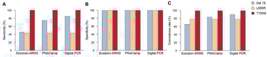 Levels of sensibility, specificity and coincidence rate of the three methods in detecting epidermal growth factor receptor (EGFR) mutations in plasma samples. EGFR mutations as detected in liquid biopsy at baseline through cell-free tumor DNA (cftDNA) analysis by the Scorpion-ARMS EGFR Plasma RGQ PCR Kit-QIAGEN, PNAClamp EGFR-PANAGENE, and the QuantStudio 3D Digital PCR System-Thermo Fisher Scientific. (A) Sensitivity, (B) specificity, and (C) coincidence rate of each of these three assays, were calculated on the basis of tissue analysis.