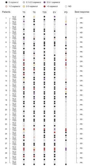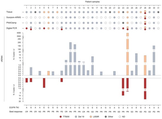 Figure 2 represents the results (Table S1) for EGFR mutational analysis in tissue biopsies compared to plasma samples, along with the type of TKI administration and relative best response for each patient (n = 31). The three platforms in liquid biopsy detected at a baseline of a total of three patients with the L858R mutation, seventeen with the Del 19 mutations, and seven with the T790M mutations, compared to seven patients with L858R, twenty with Del 19, and one patient with T790M mutations present in the tumor tissue. Six patients were found positive for the T790M mutation as detected in plasma by Digital PCR while testing negative in tissue analysis (Pt ID.1, 2, 5, 9, 23, 24). In four of these patients the T790M was co-present with either Del 19 (Pt ID. 2, 9) or L858R (Pt ID. 24, 28). In nine patients, the Del 19 mutation observed in tumor tissue was also detected with all three methods in liquid biopsy. None of these mutations was found in plasma by any of the three methods used in the four patients (Pt ID. 8, 19, 22, 27) for which tissue analysis resulted positive for either of the three activating mutations.