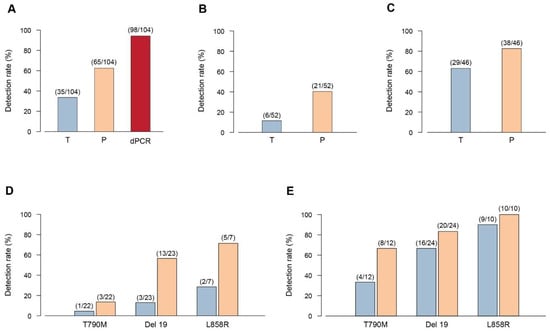 Detection rate of three platforms in plasma EGFR mutations detection. The detection rate is shown as the frequency of sample that resulted positive when tested in liquid biopsy with the three different methods: Scorpion-ARMS EGFR Plasma RGQ PCR Kit-QIAGEN (T), PNAClamp EGFR-PANAGENE (P), and QuantStudio 3D Digital PCR System-Thermo Fisher Scientific (dPCR). (A) Overall detection rate of the three platforms. (B) Overall detection rate of the Scorpion-ARMS compared to the PNAClamp for the low copy (<1 copy/µL) patient group as measured by Digital PCR. (C) Overall detection rate of Scorpion-ARMS compared to PNAClamp for the high copy (>1 copy/µL) patient group as measured by Digital PCR. (D) Comparison of Scorpion-ARMS (blue) with PNAClamp (orange) for the low copy (<1 copy/µL) patient group as measured by Digital PCR, considered separately for each EGFR main mutation (Del 19, L858R, and T790M). (E) Comparison of Scorpion-ARMS (blue) with PNAClamp (orange) for the high copy (>1 copy/µL) patient group, measured by Digital PCR, considered separately for each EGFR main mutation (T790M, Del 19, and L858R). Numbers in parenthesis indicate the relative amount of mutations detected with each specific method.