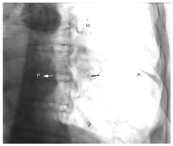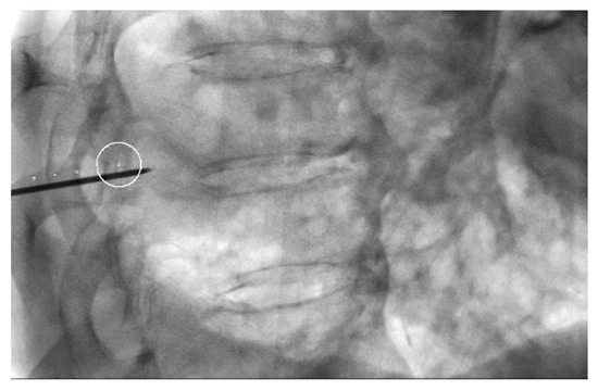 Lateral oblique projection on fluoroscopy. Virtual marks indicate the puncture route in caudal cranial direction and the circle the target. The circle is the point where the needle will reach.