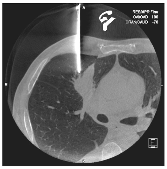 - Hiraki, T.; Mimura, H.; Gobara, H.; Shibamoto, K.; Inoue, D.; Matsui, Y.; Kanazawa, S. Incidence of and risk factors for pneumothorax and chest tube placement after CT fluoroscopy-guided percutaneous lung biopsy: Retrospective analysis of the procedures conducted over a 9-year period. Am. J. Roentgenol. 2010, 194, 809–814. [Google Scholar] [CrossRef]