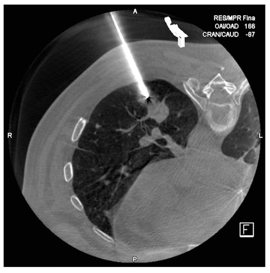 - Fior, D.; Vacirca, F.; Leni, D.; Pagni, F.; Ippolito, D.; Riva, L.; Sironi, S.; Corso, R. Virtual Guidance of Percutaneous Transthoracic Needle Biopsy with C-Arm Cone-Beam CT: Diagnostic Accuracy, Risk Factors and Effective Radiation Dose. Cardiovasc. Interv. Radiol. 2019, 42, 712–719. [Google Scholar] [CrossRef]
