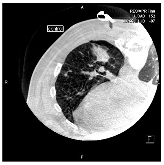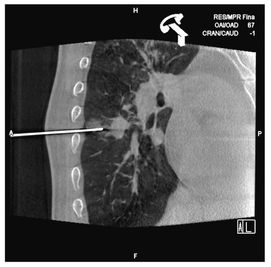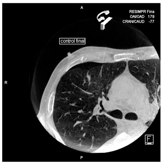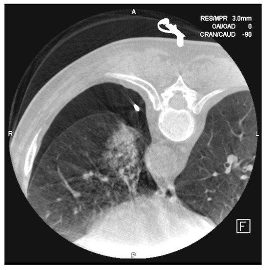 Between 1 and 4 tissue samples were obtained depending on their appearance, the presence of pneumothorax and the patient’s ability to remain immobile. We then removed the coaxial introducer in an apnea and performed a new CBCT to identify complications related to the procedure (Figure 5, Figure 6 and Figure 7). The patients remained under surveillance for 30–45 min with constant control in the area adjacent to the examination room that we allocated for it.