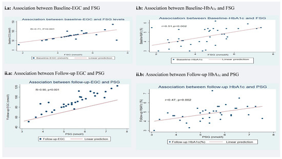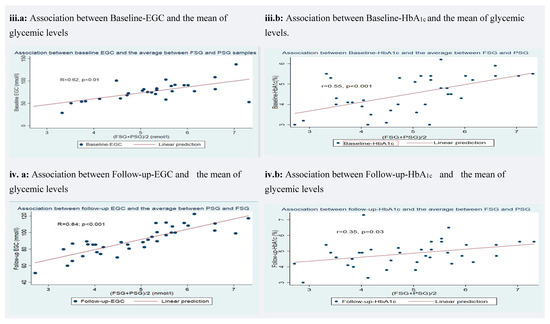 Figures (a) of the left side: EGC correlations with FSG and PSG samples at the baseline (i) and follow-up (ii) visits. Figures (b) of the right side: HbA1c correlations with FSG and PSG samples at the baseline (i) and follow-up (ii) visits. Figures (iii): Chronic glycemia correlations with the baseline EGC (a) and HbA1c (b) samples. Figures (iv): Chronic glycemia correlations with follow-up EGC (a) and HbA1c (b) samples. The chronic glycemic level was calculated as the mean between FSG and PSG. The inserted value was a coefficient of Pearson correlation, glucose levels, and p-value.