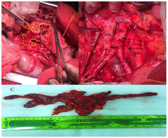 Paraaortic lymphadenectomy. (A) Resection of bulky paraaortic lymph nodes suspected for lymph node metastases; (B) Paraaortic region after lymphadenectomy; AA—abdominal aorta; IVC—inferior vena cava; LRV—left renal vein; LOV—left ovarian vein, cut and ligated where it drains into the left renal vein; IMAL—inferior mesenteric artery, cut and ligated; IVCL—inferior vena cava severed during pelvic lymphadenectomy, IVC was sutured with 4/0 absorbable suture; LA—lumbar artery; PMM—psoas major muscle; LCIA—left common iliac artery; LCIV—left common iliac vein; PR—promontory; RCIA—right common iliac artery; UR—ureter; EIA—external iliac artery; IIA—internal iliac artery; ROV—right ovarian vein; ROVL—right ovarian vein ligated where it drains in inferior vena cava; (C) Paraaortic lymph nodes removed en masse.