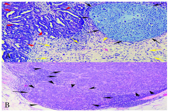 (A) Microphotographs of the tumour showing carcinoma and sarcoma components—H&Ex200-carcinomatous with high-grade serous carcinoma and sarcomatous component with stromal and chondroid differentiation. Red arrows—serous epithelial carcinoma; black arrows—chondrosarcoma; yellow arrows—endometrial stromal sarcoma. (B) Metastatic lymph node—HEx100 lymph node with metastases of carcinomatous (high-grade serous) component. Black arrows—lymph node metastases from the epithelial component.