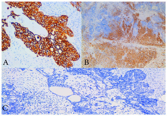 Immunohistochemical staining (IHC). (A) IHC with cytokeratin 7—diffuse and strong cytoplasmic positivity in malignant epithelial cells of high- grade serous component of the tumour, ×200 magnification; (B) IHC with desmin which shows cytoplasmic positivity of sarcomatous component with smooth muscle differentiation, ×100 magnification; (C) IHC with p53 which shows that both components are negative, magnification ×200.